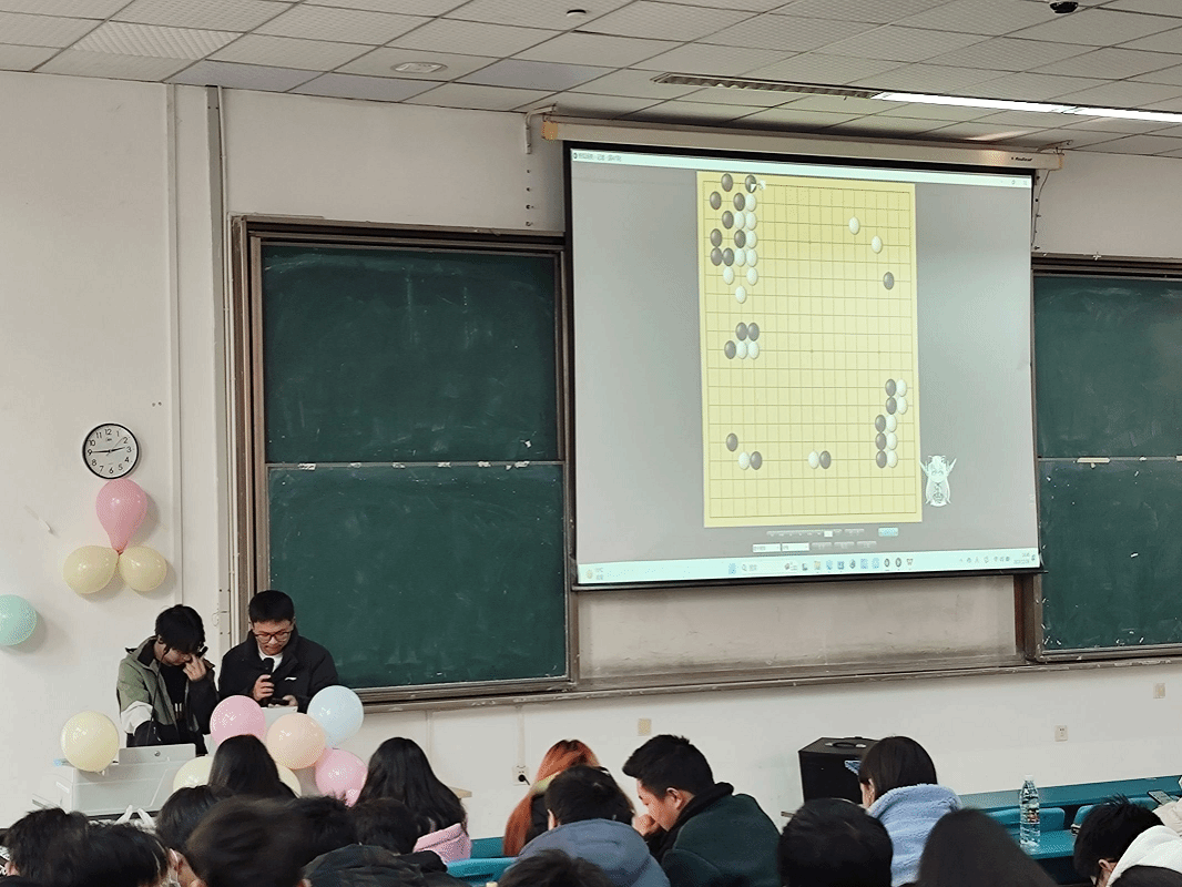 首先,围棋组开始总决赛。选手移步至隔壁教室,西华大学唐成宇与公司机本221班文志鹏担任围棋解说员,选用了星阵围棋网页版进行转播。在这里“点”一下比较好,这里现在在打劫,双方相互打吃。“尖”“长”“扳”,“虎”了一下里你来我往。每一手都是意想不到的绝妙下法,每一步的激情都迸发在方寸之间,演绎着千变万化的“纷争。局末,黑棋为124.5子,白棋胜。
